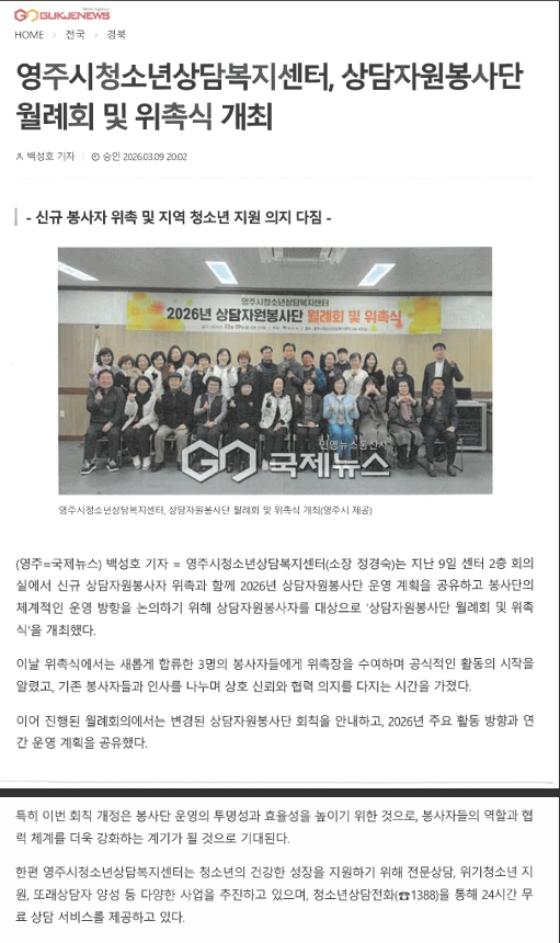 2026³â ¿µÁÖ½Ãû¼Ò³â»ó´ãº¹Áö¼¾ÅÍ »ó´ãÀÚ¿øºÀ»ç´Ü 3¿ù ¿ù·Êȸ ¹× À§Ã˽Ä