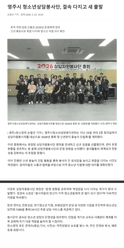 2026³â ¿µÁÖ½Ãû¼Ò³â»ó´ãº¹Áö¼¾ÅÍ »ó´ãÀÚ¿øºÀ»ç´Ü ÃÑȸ ¹× À·³îÀÌ ´ÜÇÕ